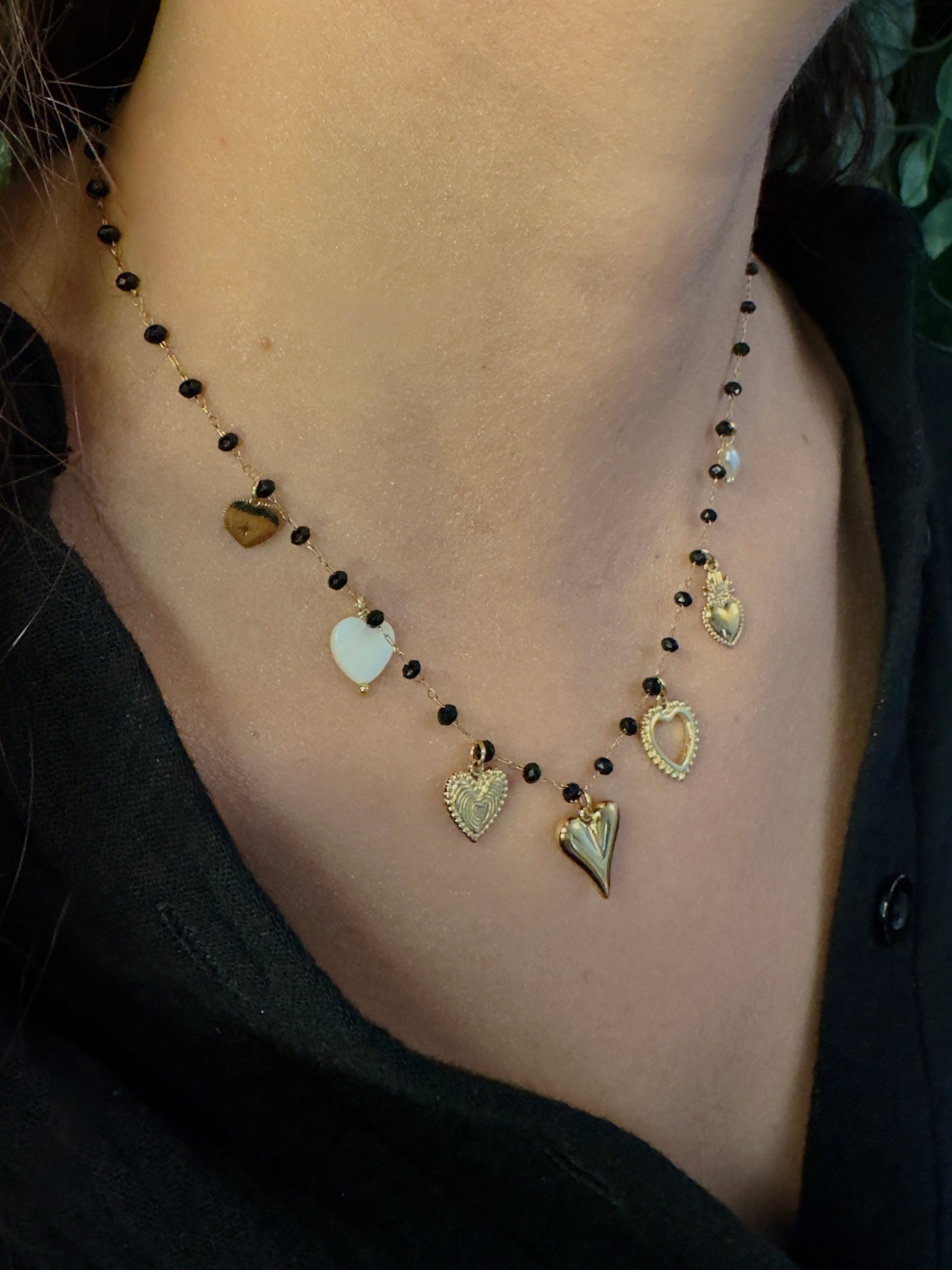 Collier perlé noir sur une chaîne avec breloques.